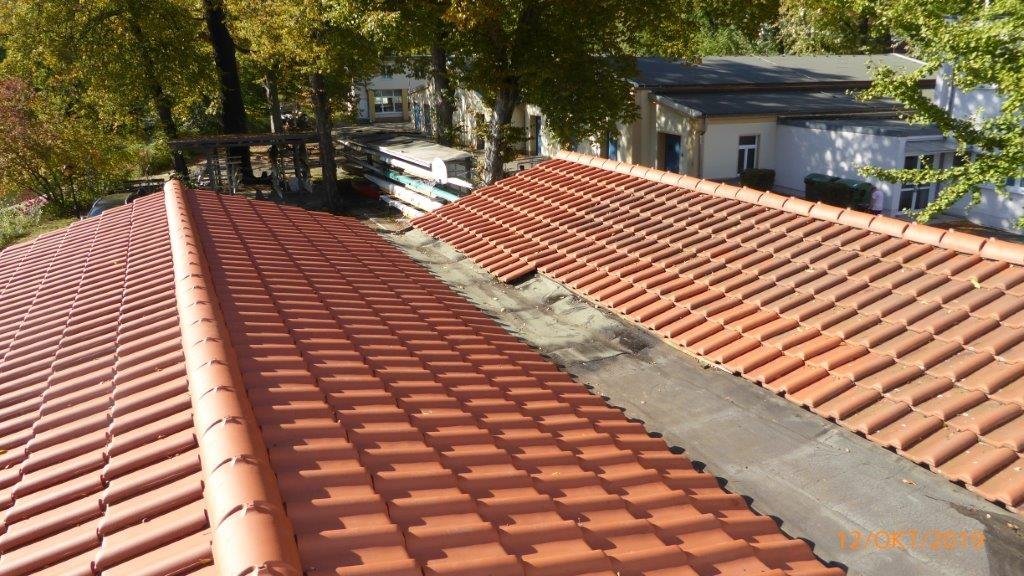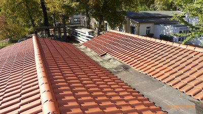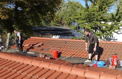 - Dachschaden: Sicher die vordringlichste Aufgabe. Die undichte Dachhaut zwischen Bootshalle 1 und Kraftraum musste repariert werden (Auswirkungen des Schadens in Halle 1 links oben zu sehen) Veit rückte mit professionellem Equipment an und verklebte eine Rolle Schweißbahn. Kjell und Popen waren mit von der Partie.