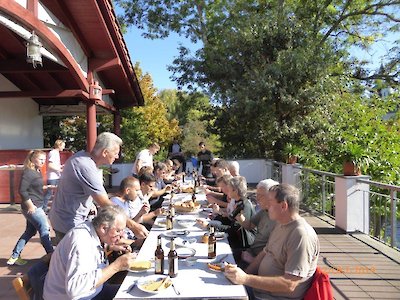 Eine vorzüglich zubereitete Kartoffelsuppe, Würstchen, Kartoffelsalat, Hackepeter – Bier und Wasser wurden 12.00 ausgegeben und in der Premium – Loction (unserer Terrasse) eingenommen.