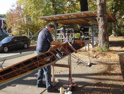 - Entsorgen der ausrangierten Boote- Marcel, Paul R. u.a.. Da Paul R. eine Verwendung für die Bootsfragmente hat, mussten die Boote nicht in die Holz und Epoxid-Bestandteile getrennt werden. Das war eine große Arbeitserleichterung, die Boote mussten nur noch geteilt werden. Die Entsorgungskosten (nicht unerheblich) wurden ebenfalls eingespart.