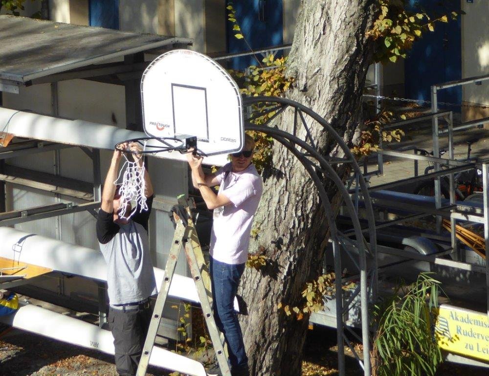- Ein neuer Basketballkorb wurde von Niklas u.a. gespendet und montiert.